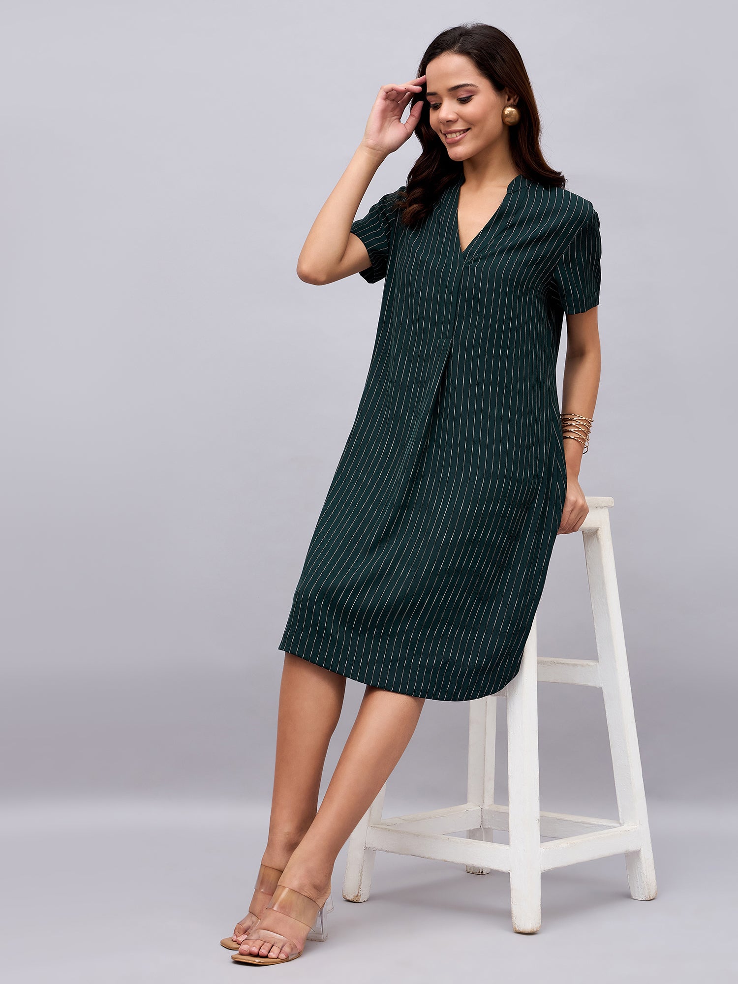 Elevate your casual style with this elegant green striped A-line dress. Featuring a Mandarin collar and short regular sleeves, this chic dress is perfect for creating an effortlessly stylish look. The knee-length curved hem adds a graceful touch, making it ideal for casual outings, brunches, or day events. Crafted from high-quality satin fabric, it offers a smooth, sleek appearance while keeping you comfortable and breathable all day long.