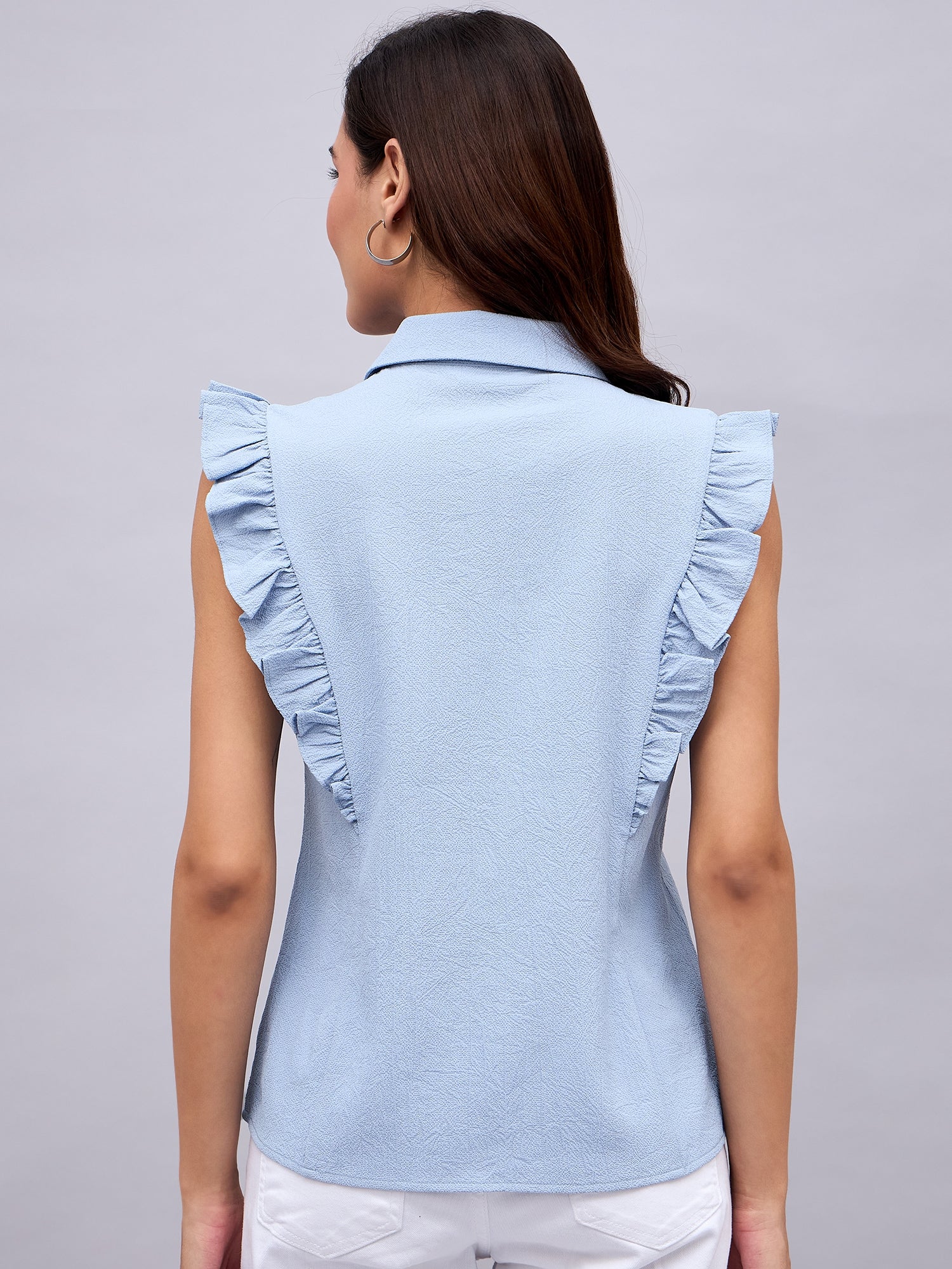 | Elevate your casual chic with NUWAH’s Powder Blue Ruffle Sleeve Top. Designed in lightweight polyester crepe, this top features delicate ruffle detailing along the shoulders and a flattering buttoned front. Perfect for summer brunches, workdays, or holiday getaways – pair it effortlessly with white trousers or denims for a breezy look. |